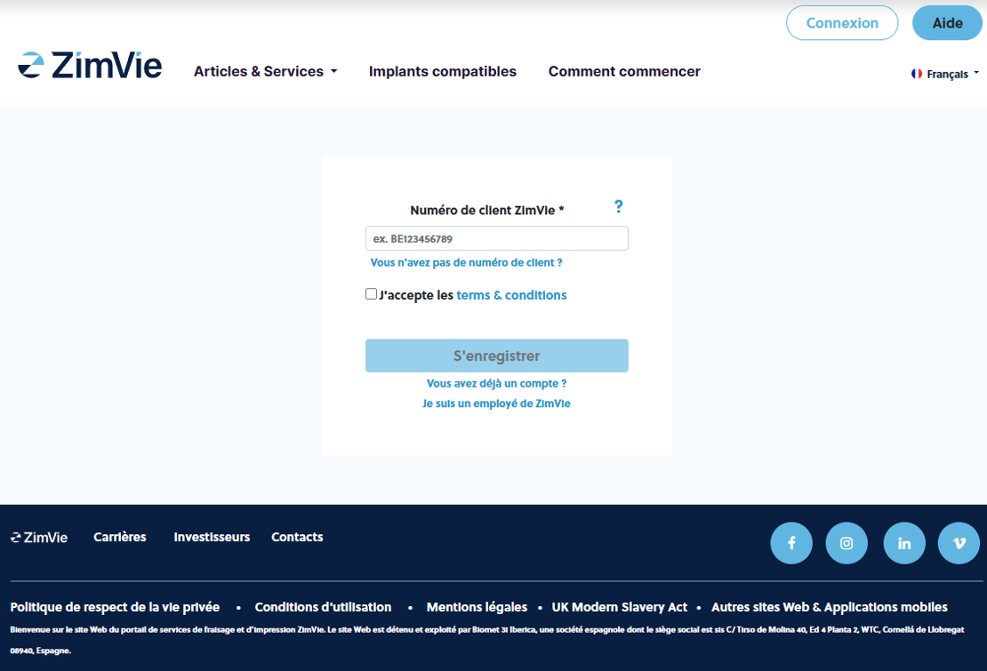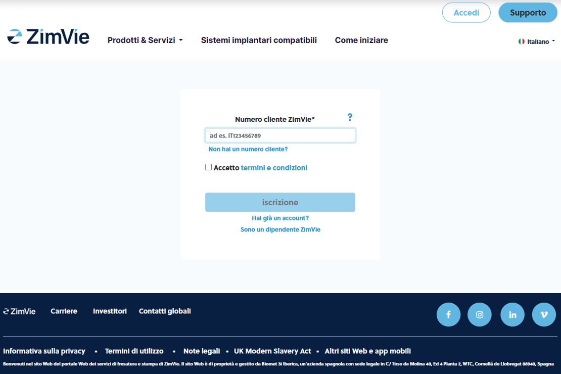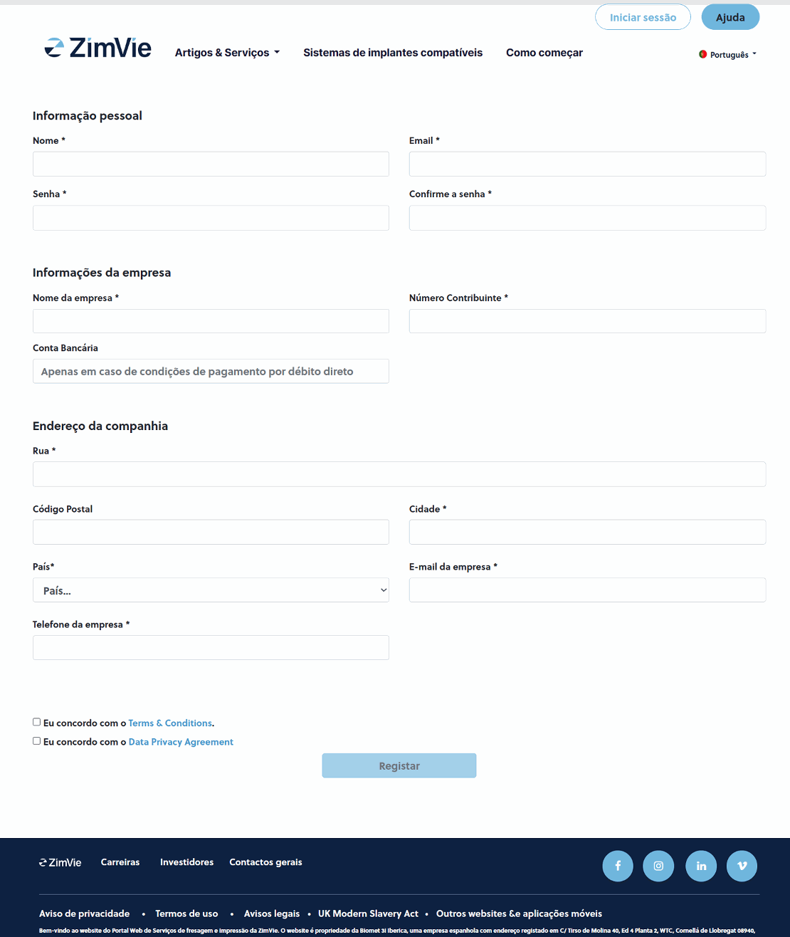 - To become a ZimVie customer you have to provide your information: Name, Email, create a password, and company information (i.e. Company name, company e-mail, phone, identification number, and address)